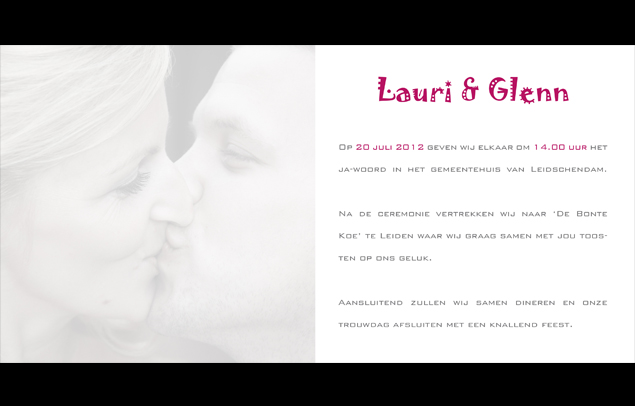Dubbele trouwkaart, gevouwen formaat ca. 13,5 x 13,5 cm. Standaard uitgevoerd in fuchsiaroze en grijstinten.