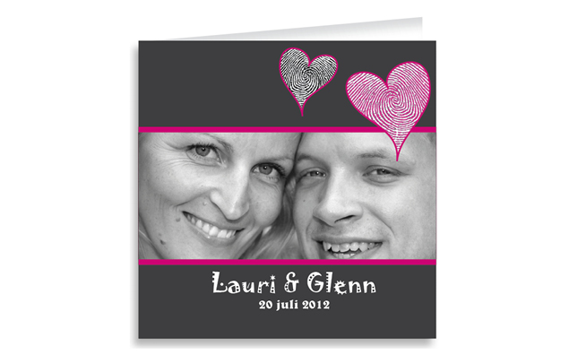 In de hartjes staan jullie vingerafdrukken. De aanleverspecificaties hiervoor ontvangen jullie per mail. Uiteraard kunnen de hartjes ook in een effen kleur worden gedrukt zonder jullie vingerafdrukken. De kaart is aan te passen in jullie eigen kleuren, ander lettertype en eventueel met een afbeelding van jullie trouwringen e/o jullie foto als watermerk in de binnenzijde. De kaart kost incl. full-color bedrukking € 1,70 p.st. op 300 grams wit karton en € 2,07 op luxe parelmoer karton. Alle prijzen zijn excl. 19% BTW.