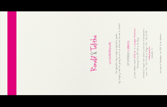 Deze trouwkaart is te bestellen in de standaard lay-out maar kan ook helemaal aangepast worden naar jullie wensen. Bijvoorbeeld met andere kleuren of in een ander design. Bestel je deze uitnodiging in de standaard opmaak dan betaal je € 15,- opmaakkosten voor het maken van de tekstuele lay-out. Bestel je deze kaart in andere kleuren of in een ander design dan betaal je € 22,50 voor het aangepaste ontwerp en het opmaken van de tekstuele lay-out. Een tekstwissel (bijvoorbeeld andere tekst avondgasten) kost € 5,-. De kaart kost incl. full-color bedrukking € 2,50 p.st. op 300 grams wit karton en € 2,87 op luxe parelmoer karton en € 2,99 op Oud Hollands geschept karton. Alle prijzen zijn excl. 21% BTW.