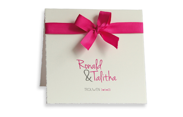 Trouwkaart met lint in fuchsia roze standaard gedrukt op Oud Hollands geschept papier.