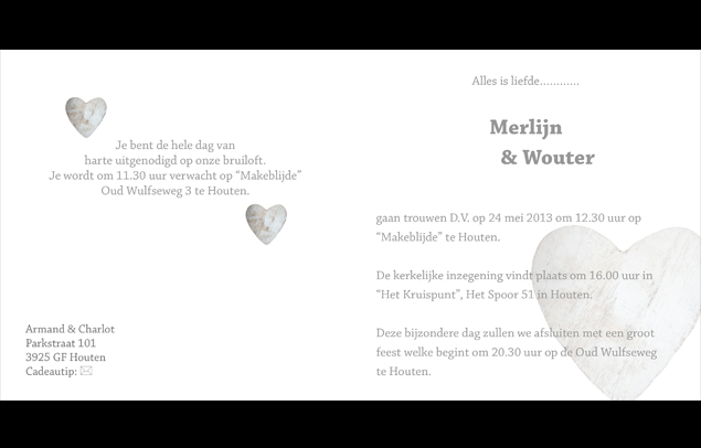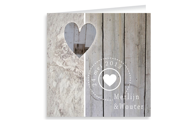 Deze trouwkaart met hout design is te bestellen in de standaard lay-out maar kan ook helemaal aangepast worden naar jullie wensen. Bijvoorbeeld met andere kleuren of in een ander design. Bestel je deze uitnodiging in de standaard opmaak dan betaal je € 15,- opmaakkosten voor het maken van de tekstuele lay-out. Bestel je deze kaart in andere kleuren of in een ander design dan betaal je € 22,50 voor het aangepaste ontwerp en het opmaken van de tekstuele lay-out. Een tekstwissel (bijvoorbeeld andere tekst avondgasten) kost € 5,-. De kaart kost incl. full-color bedrukking € 1,70 p.st. op 300 grams mat wit karton en € 2,07 op luxe parelmoer karton. Alle prijzen zijn excl. 21% BTW.