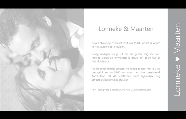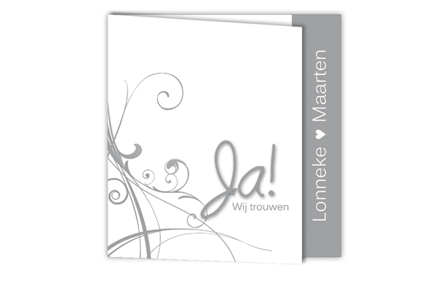 Deze trouwkaart is te bestellen in de standaard lay-out maar kan ook helemaal aangepast worden naar jullie wensen. Bijvoorbeeld met andere kleuren of in een ander design. Bestel je deze uitnodiging in de standaard opmaak dan betaal je € 15,- opmaakkosten voor het maken van de tekstuele lay-out. Bestel je deze kaart in andere kleuren of in een ander design dan betaal je € 22,50 voor het aangepaste ontwerp en het opmaken van de tekstuele lay-out. Een tekstwissel (bijvoorbeeld andere tekst avondgasten) kost € 5,-. De kaart kost incl. full-color bedrukking € 1,70 p.st. op 300 grams mat wit karton en € 2,07 op luxe parelmoer karton (conform voorbeeld). Alle prijzen zijn excl. 21% BTW.