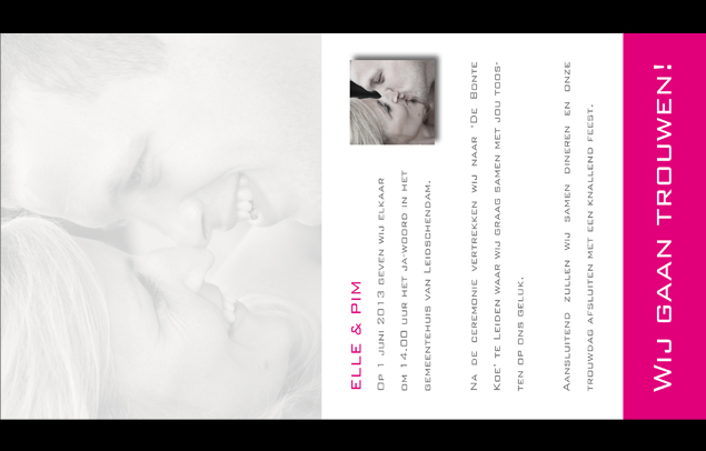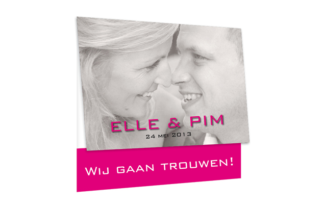 Trouwkaart met foto uitgevoerd in fuchsia roze en grijstinten.
