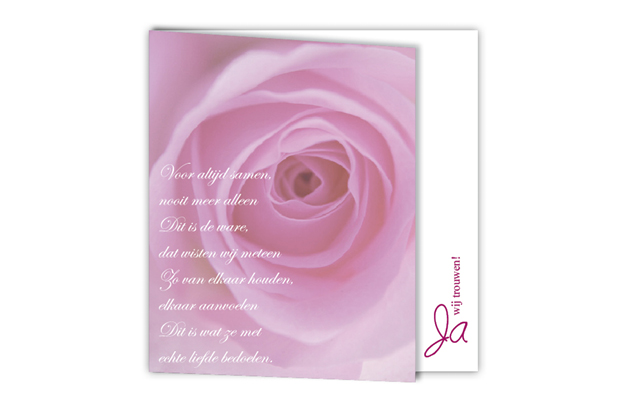 Deze trouwkaart met roos is te bestellen in de standaard lay-out maar kan ook helemaal aangepast worden naar jullie wensen. Bijvoorbeeld met andere kleuren of in een ander design. Bestel je deze uitnodiging in de standaard opmaak dan betaal je € 15,- opmaakkosten voor het maken van de tekstuele lay-out. Bestel je deze kaart in andere kleuren of in een ander design dan betaal je € 22,50 voor het aangepaste ontwerp en het opmaken van de tekstuele lay-out. Een tekstwissel (bijvoorbeeld andere tekst avondgasten) kost € 5,-. De kaart kost incl. full-color bedrukking € 1,70 p.st. op 300 grams mat wit karton en € 2,07 op luxe parelmoer karton. Alle prijzen zijn excl. 21% BTW.