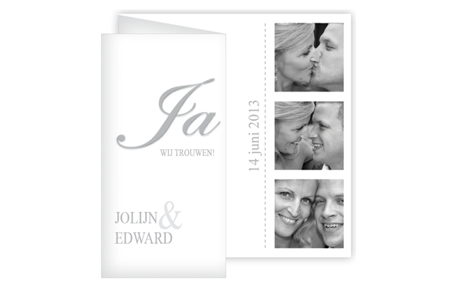 Trouwkaart met foto’s van jullie zelf in grijstinten.
