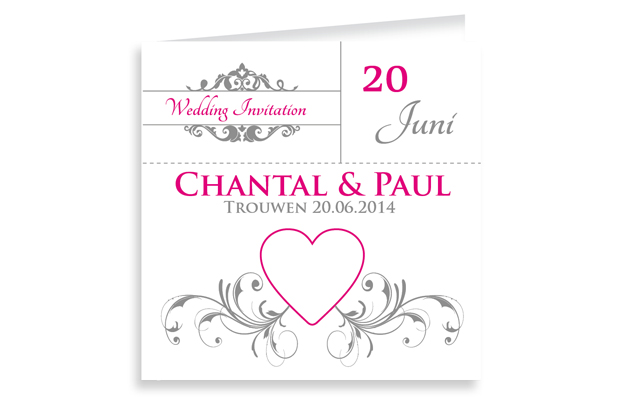 Vintage trouwkaart in fuchsia roze en grijstinten.