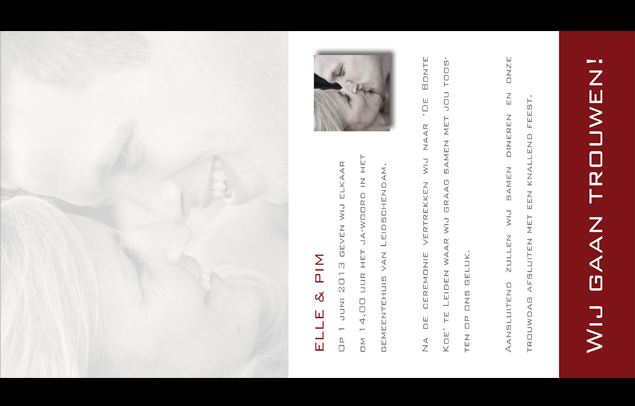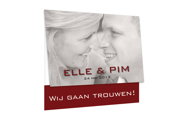 Trouwkaart met foto van jullie zelf uitgevoerd in rode tinten.