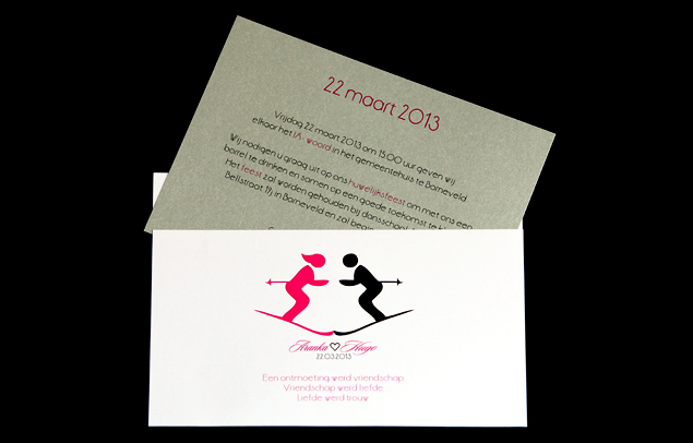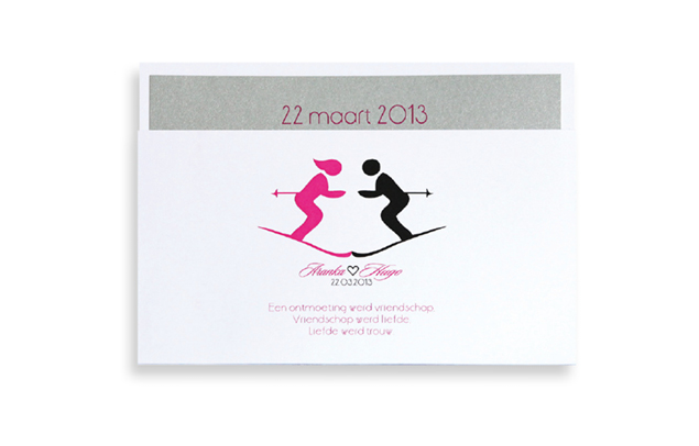 Deze trouwkaart is te bestellen in de standaard lay-out maar kan ook helemaal aangepast worden naar jullie wensen. Bijvoorbeeld met andere kleuren of in een ander design. Bestel je deze uitnodiging in de standaard opmaak dan betaal je € 15,- opmaakkosten voor het maken van de tekstuele lay-out en een persoonlijk trouwlogo. Bestel je deze kaart in andere kleuren of in een ander design dan betaal je € 22,50 voor het aangepaste ontwerp , het opmaken van de tekstuele lay-out en het trouwlogo. Een tekstwissel (bijvoorbeeld andere tekst avondgasten) kost € 5,-. De volgende variaties zijn mogelijk: omslag mat wit karton – losse kaart parelmoer zilver, omslag mat wit karton – losse kaart champagne parelmoer, omslag zilver parelmoer – losse kaart mat wit karton. Bij de kaarten wordt 2-zijdig kleefband geleverd wat door jullie bevestigd dient te worden op de omslag. Alle variaties kosten incl. full-color bedrukking € 2,70 p.s.t. Alle prijzen zijn excl. 21% BTW.