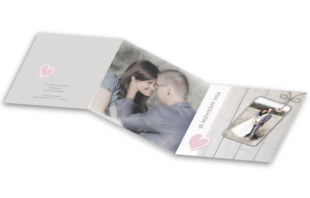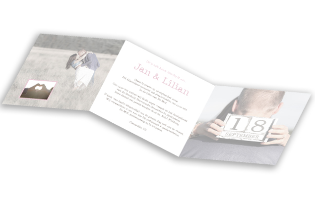 Deze trouwkaart uitgevoerd als 3-luik biedt ruimte voor meerdere foto’s van jullie is te bestellen in de standaard lay-out maar kan ook helemaal aangepast worden naar jullie wensen. Bijvoorbeeld met andere kleuren of in een ander design. Bestel je deze uitnodiging in de standaard opmaak dan betaal je € 15,- opmaakkosten voor het maken van de tekstuele lay-out. Bestel je deze kaart in andere kleuren of in een ander design dan betaal je € 22,50 voor het aangepaste ontwerp en het opmaken van de tekstuele lay-out. Een tekstwissel (bijvoorbeeld andere tekst avondgasten) kost € 5,-. De kaart kost incl. full-color bedrukking € 1,70 p.st. op 300 grams mat wit karton, € 2,07 op feestelijk parelmoer karton en € 2,50 op recycled karton voor een stoere vintage uitstraling. De foto’s kun je zelf aanleveren of je kunt door ons een professionele loveshoot laten maken. Alle prijzen zijn excl. 21% BTW.