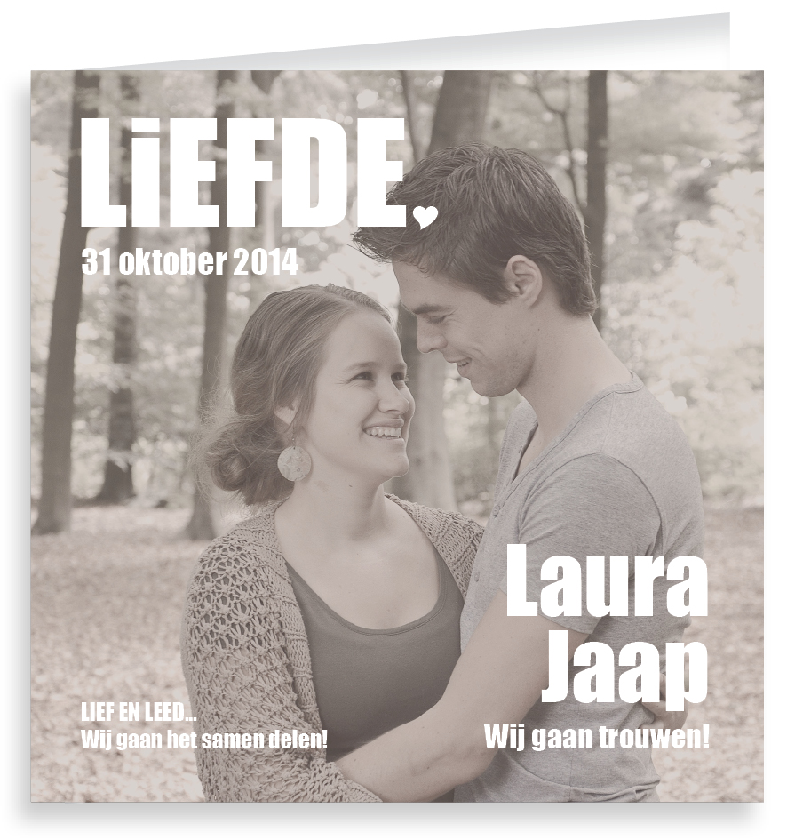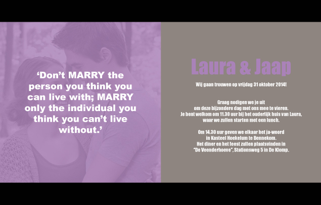 Deze trouwkaart is te bestellen in de standaard lay-out maar kan ook helemaal aangepast worden naar jullie wensen. Bijvoorbeeld met andere kleuren of in een ander design. Bestel je deze uitnodiging in de standaard opmaak dan betaal je € 15,- opmaakkosten voor het maken van de tekstuele lay-out. Bestel je deze kaart in andere kleuren of in een ander design dan betaal je € 22,50 voor het aangepaste ontwerp en het opmaken van de tekstuele lay-out. Een tekstwissel (bijvoorbeeld andere tekst avondgasten) kost € 5,-. De kaart kost incl. full-color bedrukking € 1,70 p.st. op 300 grams mat wit karton, € 2,07 op luxe parelmoer karton en € 2,25 op stoer recylced karton (voor een vintage uitstraling). Alle prijzen zijn excl. 21% BTW.