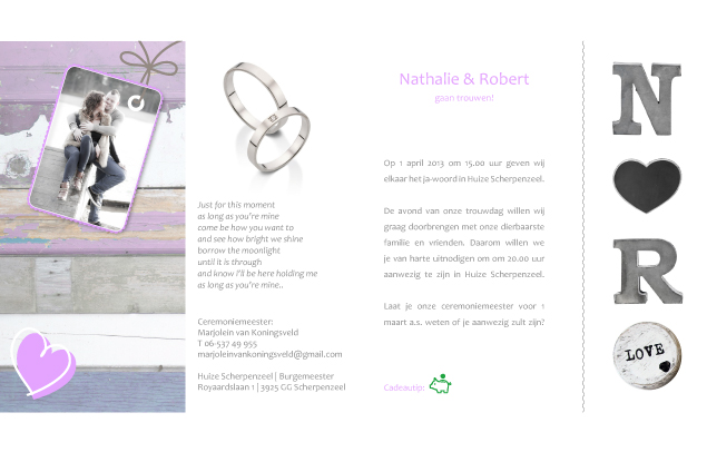 Deze trouwkaart met een foto van jullie is te bestellen in de standaard lay-out maar kan ook helemaal aangepast worden naar jullie wensen. Bijvoorbeeld met andere kleuren of in een ander design. Bestel je deze uitnodiging in de standaard opmaak dan betaal je € 15,- opmaakkosten voor het maken van de tekstuele lay-out. Bestel je deze kaart in andere kleuren of in een ander design dan betaal je € 22,50 voor het aangepaste ontwerp en het opmaken van de tekstuele lay-out. Een tekstwissel (bijvoorbeeld andere tekst avondgasten) kost € 5,-. De kaart kost incl. full-color bedrukking € 1,70 p.st. op 300 grams mat wit karton, € 2,07 op feestelijk parelmoer karton en € 2,25 op recycled karton voor een stoere vintage uitstraling. De foto kun je zelf aanleveren of je kunt door ons een professionele loveshoot laten maken. Alle prijzen zijn excl. 21% BTW.