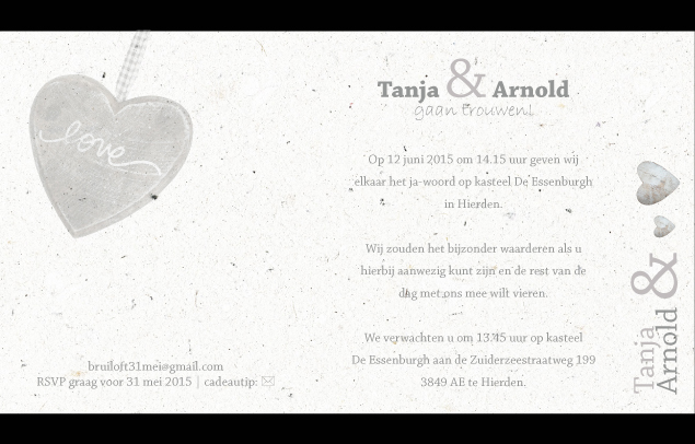 Trouwkaart opgemaakt met steigerhout en houten hart. Deze trouwkaart is te bestellen in de standaard lay-out maar kan ook helemaal aangepast worden naar jullie wensen. Bijvoorbeeld met andere kleuren of in een ander design. Bestel je deze trouwkaart in de standaard opmaak dan betaal je € 15,- opmaakkosten voor het maken van de tekstuele lay-out. Bestel je deze trouwkaart in andere kleuren of in een ander design dan betaal je € 22,50 voor het aangepaste ontwerp en het opmaken van de tekstuele lay-out. Een tekstwissel (bijvoorbeeld andere tekst avondgasten) kost € 5,-. De trouwkaart kost incl. full-color bedrukking € 1,70 p.st. op 300 grams mat wit karton en € 2,25 op recyclet karton (zoals afgebeeld). Alle prijzen zijn excl. 21% BTW.