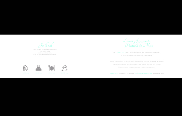 Deze trouwkaart is te bestellen in de standaard lay-out maar kan ook helemaal aangepast worden naar jullie wensen. Bijvoorbeeld met andere kleuren of in een ander design. Bestel je deze uitnodiging in de standaard opmaak dan betaal je € 15,- opmaakkosten voor het maken van de tekstuele lay-out. Bestel je deze kaart in andere kleuren of in een ander design dan betaal je € 22,50 voor het aangepaste ontwerp en het opmaken van de tekstuele lay-out. Een tekstwissel (bijvoorbeeld andere tekst avondgasten) kost € 5,-. De kaart kost incl. full-color bedrukking € 1,70 p.st. op mat wit karton, € 2,07 op feestelijk parelmoer karton en € 2,25 op stoer recycled karton. Alle prijzen zijn excl. 21% BTW.