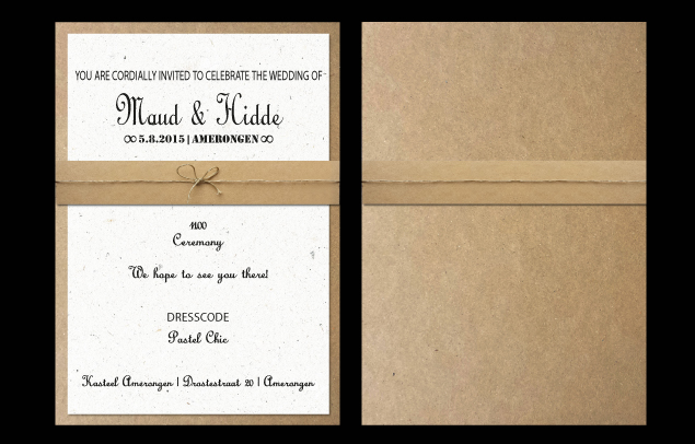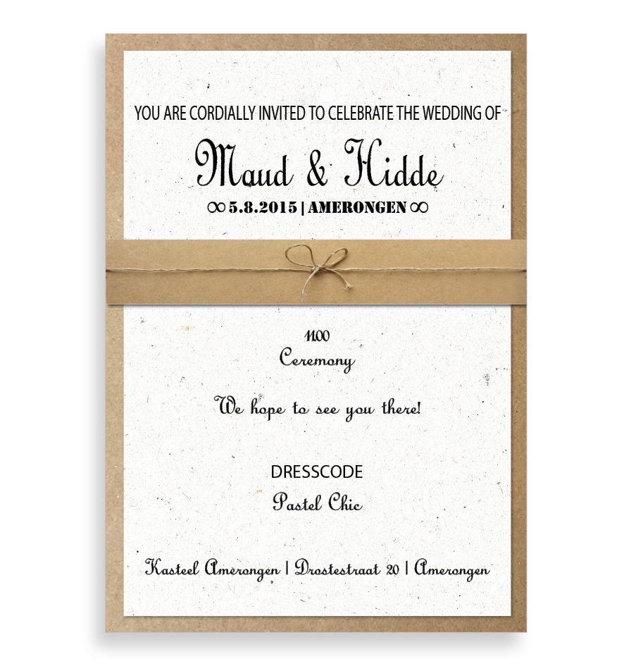 Deze trouwkaart bestaat uit 2 lagen. De 1e laag is van bruin recycled karton en de 2e laag is een dekblad van wit recycled papier welke bedrukt is. Dit vel wordt los bijgeleverd (te bevestigen met papierlijm) evenals de wikkels en het sisal touw. De trouwkaart te bestellen in de standaard lay-out maar kan ook helemaal aangepast worden naar jullie wensen. Bijvoorbeeld met andere kleuren of in een ander design. Bestel je deze trouwkaart in de standaard opmaak dan betaal je € 15,- opmaakkosten voor het maken van de tekstuele lay-out. Bestel je deze trouwkaart in andere kleuren of in een ander design dan betaal je € 22,50 voor het aangepaste ontwerp en het opmaken van de tekstuele lay-out. Een tekstwissel (bijvoorbeeld andere tekst avondgasten) kost € 5,-. De trouwkaart kost incl. bedrukking € 2,45 p.st. op stoer recycled karton. De afbeelding toont de kleurstelling bruin recycled karton + dekblad in wit recycled karton. Omgekeerd is uiteraard ook mogelijk. Standaard worden gratis witte enveloppen bij de kaarten geleverd. Tegen meerprijs zijn bijpassende recycled enveloppen te bestellen. Alle prijzen zijn excl. 21% BTW.